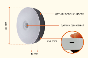 Светильник предназначен для беспроводного умного освещения. Датчики движения включаются только в темноте, когда объект находится в диапазоне 3 м и автоматически выключается через 15-20 секунд, когда объект выходит из заданного диапазона. Зарядка осуществляется через USB-порт. Зарядное устройство можно подключить к компьютеру или мобильному телефону.