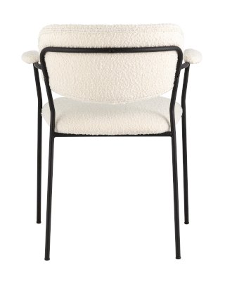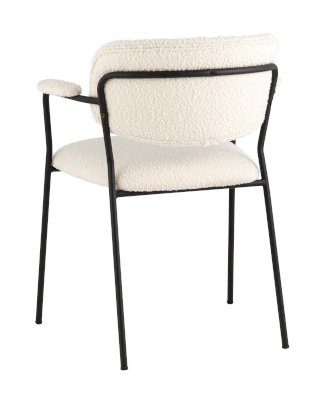 Современный обеденный стул с подлокотниками и металлическими ножками. Обивка выполнена из мягкой и легкой ткани букле. Красивый и очень мягкий материал, который оставляет ощущение теплоты и уюта. Металлический каркас черного цвета огибает спинку и плавно переходит из подлокотников в ножки. Широкое сиденье обеспечивает удобную посадку и уют. На подлокотниках для дополнительного комфорта предусмотрены мягкие накладки.