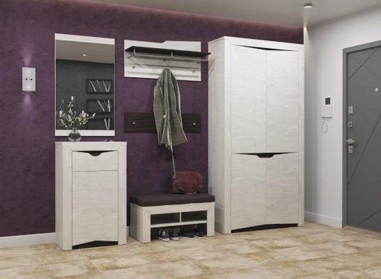 И вновь дизайнерская находка – два в одном! Скамейка-тумба с мягким верхом и обувница. Верх тумбы выполнен из велюра – очень удобно и комфортно присесть и надеть или снять обувь, которую тут же можно поставить на полочку под мягким сиденьем. А на «нижнем этаже» можно хранить домашнюю обувь. У тумбы широкое и устойчивое основание, которое выдерживает даже очень «весомого» человека. Все продумано!