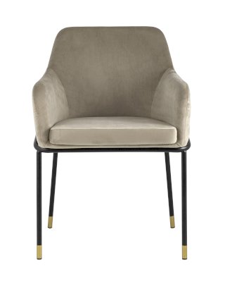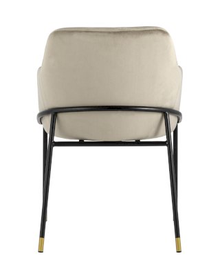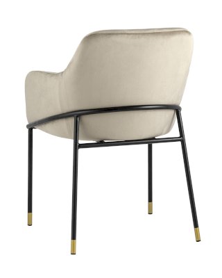 Стул с эргономичной посадкой, мягким сиденьем и широкой удобной спинкой и мягкими подлокотниками. Каркас и ножки черного матового цвета изготовлены из прочного металла с золотым декором, обивка из велюра - износостойкого материала с приятной на ощупь структурой.