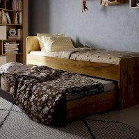 Кроватный ящик открывается за ручку-карман. Такой импровизированный карман дает возможность аккуратно сложить необходимые перед сном вещи: книгу, телефон, любимую игрушку. Выдвижной ящик используйте как место для хранения или как дополнительное спальное место. Если планируется дополнительное полноценное спальное место, достаточно не устанавливать делитель при сборке и приобрести матрас. Рекомендуемый размер матраса для основного спального места - 2000х900 мм, для дополнительного спального места - 1900х800х180 мм. Дно спального места кровати из ЛДСП усилено специальными ребрами жесткости из фанеры 18 мм и рассчитано на нагрузку до 80 кг.