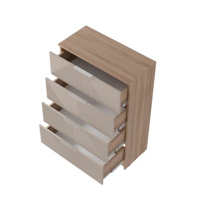 Комод "Эмилия" КМ-02 обладает четырьмя просторными ящиками для одежды и белья. Благодаря эргономичным фасадам открывание ящиков становится удобным и лёгким.