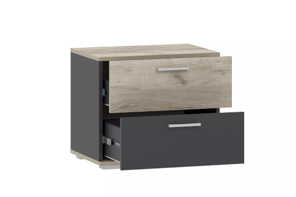 Тумба оснащена двумя выдвижными ящиками, которые выдвигаются плавно и бесшумно благодаря шариковым направляющим, а лаконичные ручки серого цвета подчеркивают стиль коллекции. В ящиках можно удобно расположить обувь. Дополните тумбу шкафом из одноименной коллекции, чтобы создать особо гармоничную атмосферу.